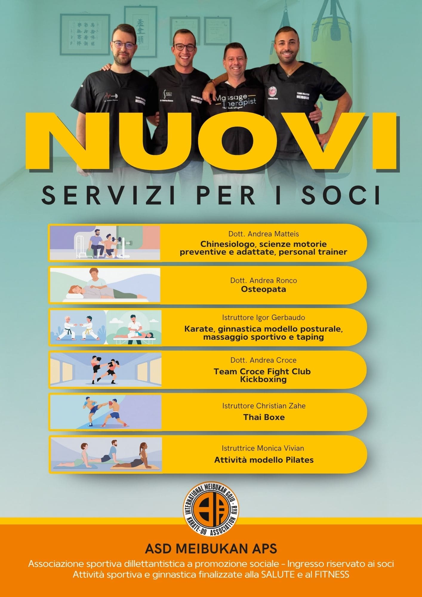 Un ambiente accogliente per il tuo allenamento. Scegli tra palestra attrezzata (libera o con Personal Trainer), corsi di Ginnastica Posturale e Modello Pilates, o discipline come Karate, Kickboxing e Thai Boxe per adulti e bambini. Completa il tuo percorso con massaggi sportivi, kinesio taping e osteopatia.